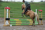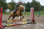 ... a taktikánk igazán egyszerű. 2 ugrás között kihasználjuk a lehető legtöbb helyett, nagy ívből kanyarodunk rá az akadályokra. Ha valami okból kiugrana az akadály elől pl. jobbra, akkor a következő rálovagláskor az akadály bal felére lovagolunk. Akadály előtt határozottan lovagolom előre, és ha kell a pálcasegítséget is igénybe veszem.